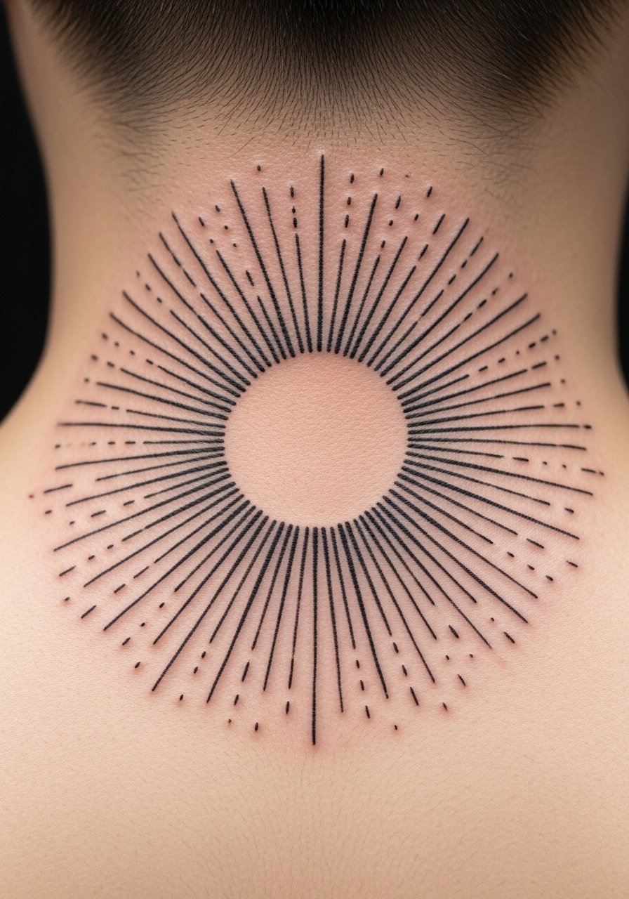 A sunburst or concentric circle motif at the nape is minimal but impactful. The area heals well if you keep hair away and avoid friction. In my experience, this placement is less painful than sternum or ankle but still visible enough to be a personal talisman. Keep the inner circle spacing deliberate; overlapping rings that are too tight blur over time.