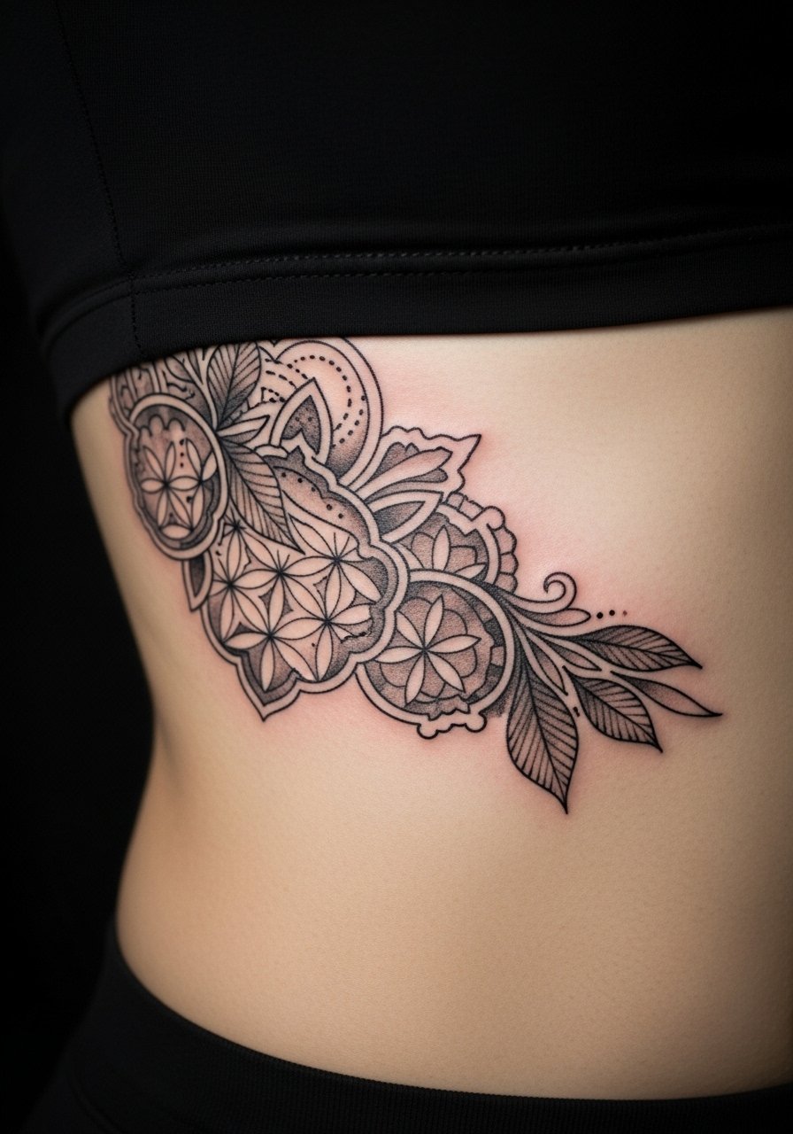 Ribcage geometry is bold and intimate. Pain is high but placement is easy to cover with clothing. I’ve noticed rib panels look best when the artist follows the body’s natural curve—this avoids distortion when you breathe or move. Healing requires careful aftercare because clothing rub can cause scabbing issues. Keep patterns slightly larger to counteract potential blurring.