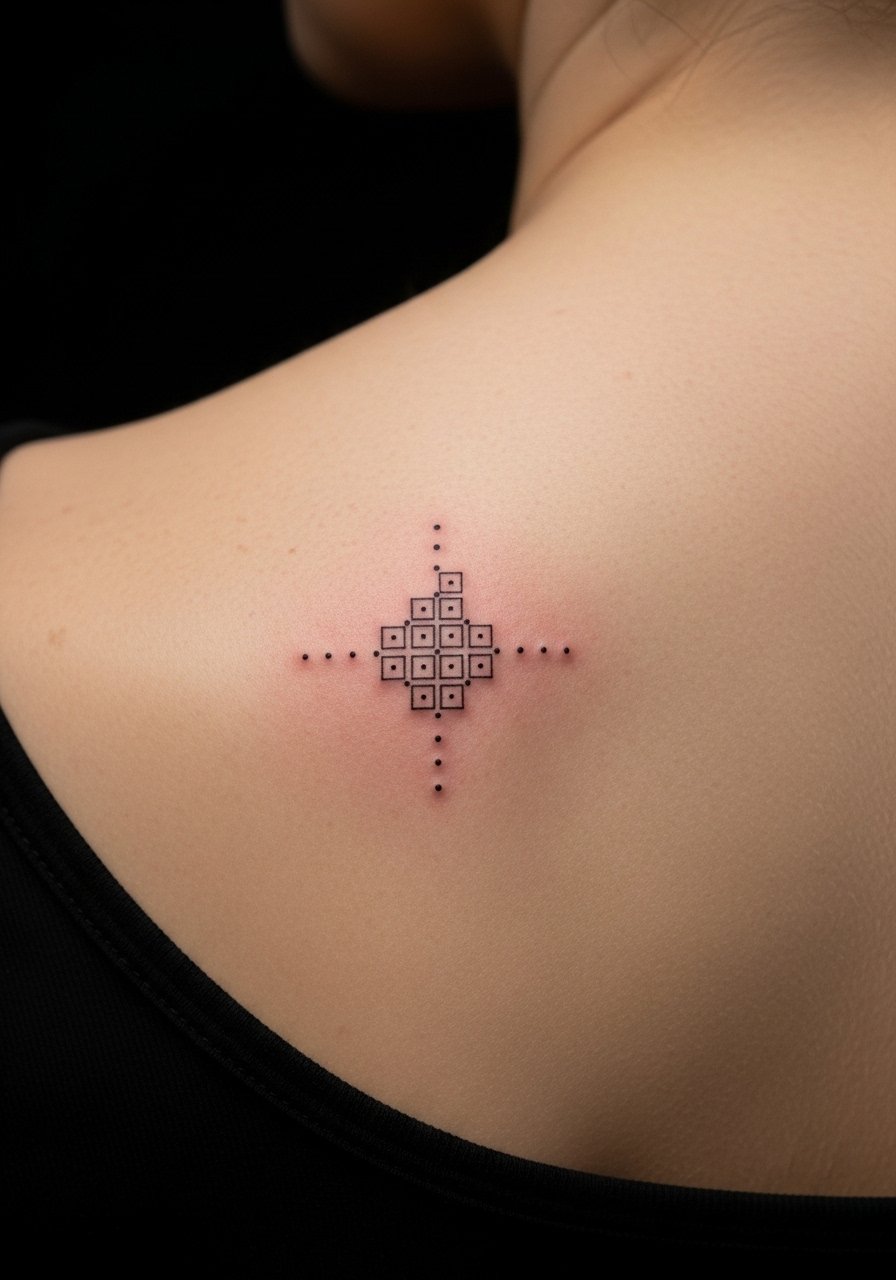 Behind the shoulder is low-pain and perfect for a small grid or constellation of shapes. Micro-grids look best when the artist balances dotwork and line; too fine and the grid dissolves. I've suggested this placement to friends who want a sacred geometry piece that’s discreet but meaningful. Follow-up touch-ups are less common here because the area isn’t exposed to constant friction.