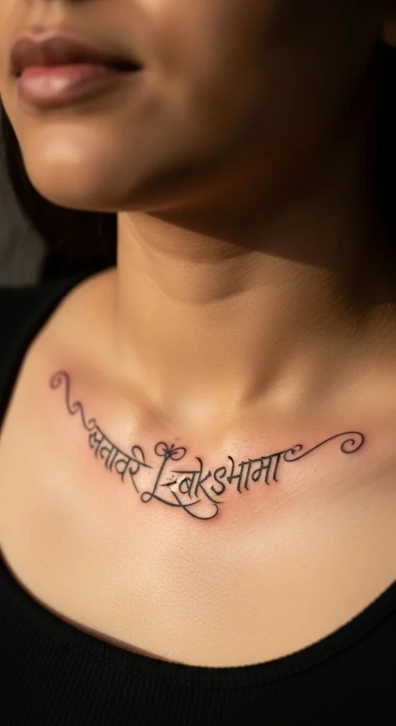 Lakshmi represents abundance and good fortune. The name flows gently in Sanskrit and looks elegant along the collarbone. A horizontal placement keeps it easy on the wallet because the artist can tattoo it quickly. Add a tiny dot or star accent if you want a finishing touch. Ask your artist to test the spacing on your skin before starting.