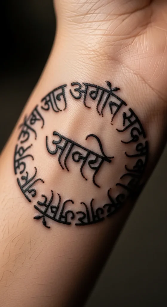 A small shloka wrapped around the wrist creates a soft jewelry effect. Choose a short verse so the characters stay readable. Keep the band loose so it doesn’t distort with movement. Many people choose the Gayatri fragment or a peace verse for this style. Ask your artist to use consistent line weight to keep the bracelet smooth around your wrist.