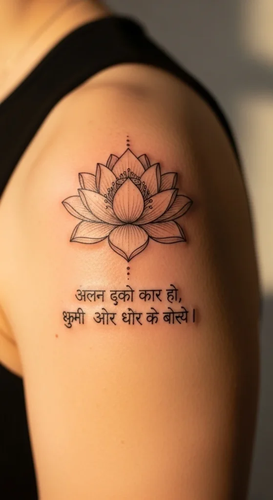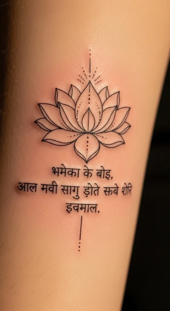 You can pair a simple lotus with any short Sanskrit quote. This combination works beautifully on ankles, backs, and forearms. The lotus should stay clean and airy with no shading. Choose a quote with four to six characters for a compact look. Keep the placement centered so the design looks balanced. Using a stencil lets you preview the spacing before tattooing.