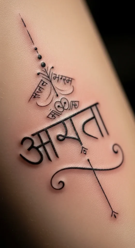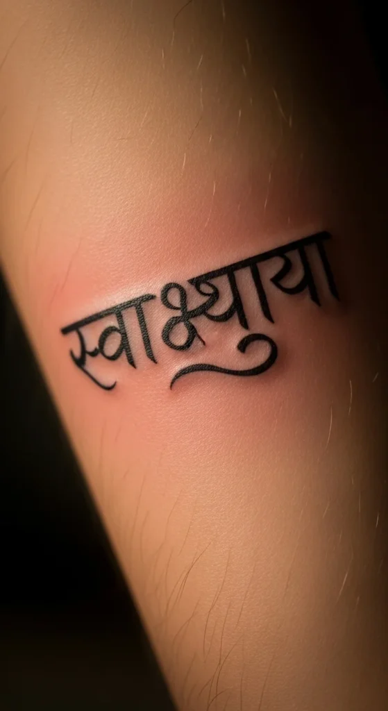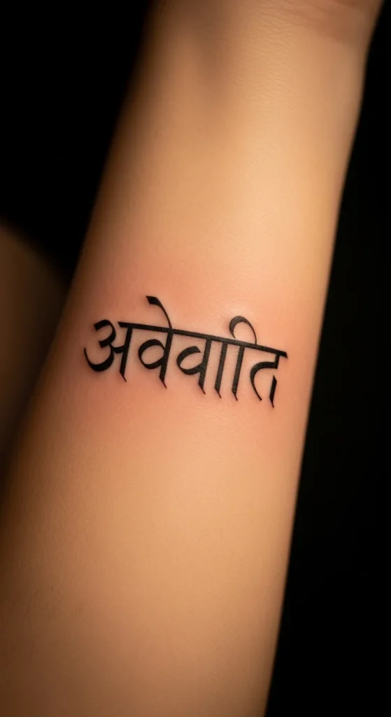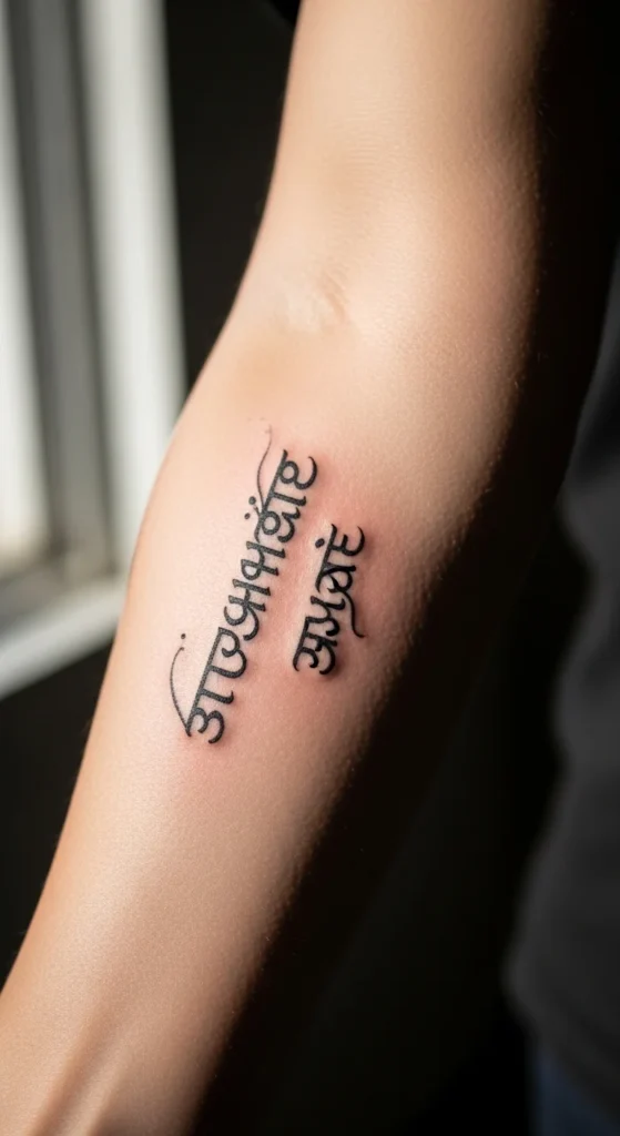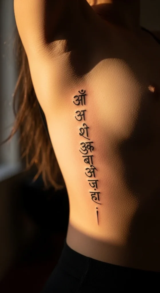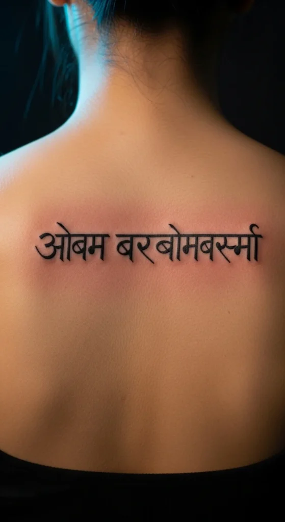 Many people choose family names or meaningful personal names. Sanskrit script makes even simple names look graceful. Use a clean Devanagari font and avoid decorative curves. This keeps the tattoo readable. Try printing the name in multiple sizes before choosing your final look. Placement works well on the inner forearm or ankle.