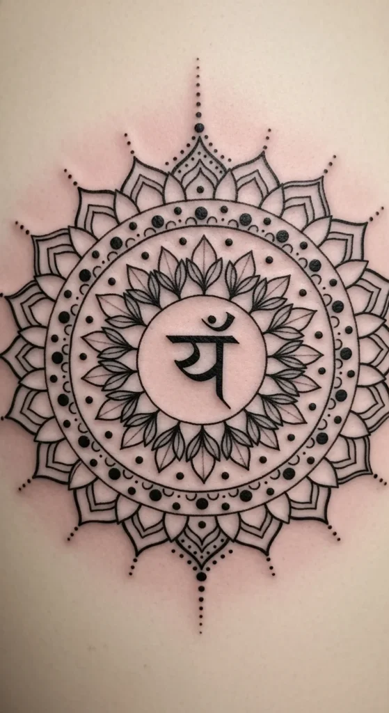 A mandala with a Sanskrit symbol inside blends symmetry with spiritual meaning. Keep the mandala simple so the symbol stays visible. You can reduce the number of petals to keep the session short and affordable. The piece fits nicely on the shoulder blade or thigh. Test the design on paper first and reduce petal count if it feels too busy.