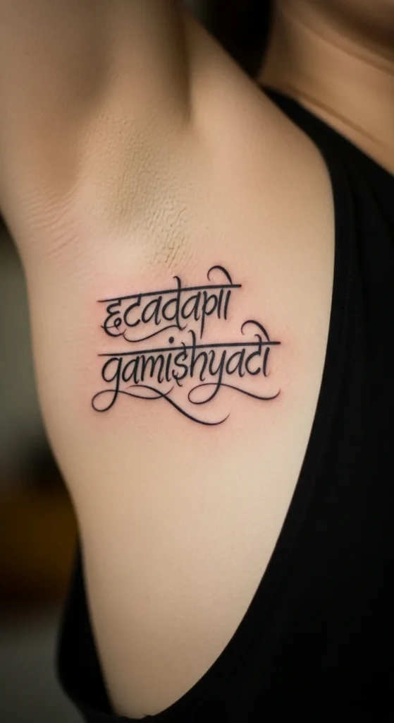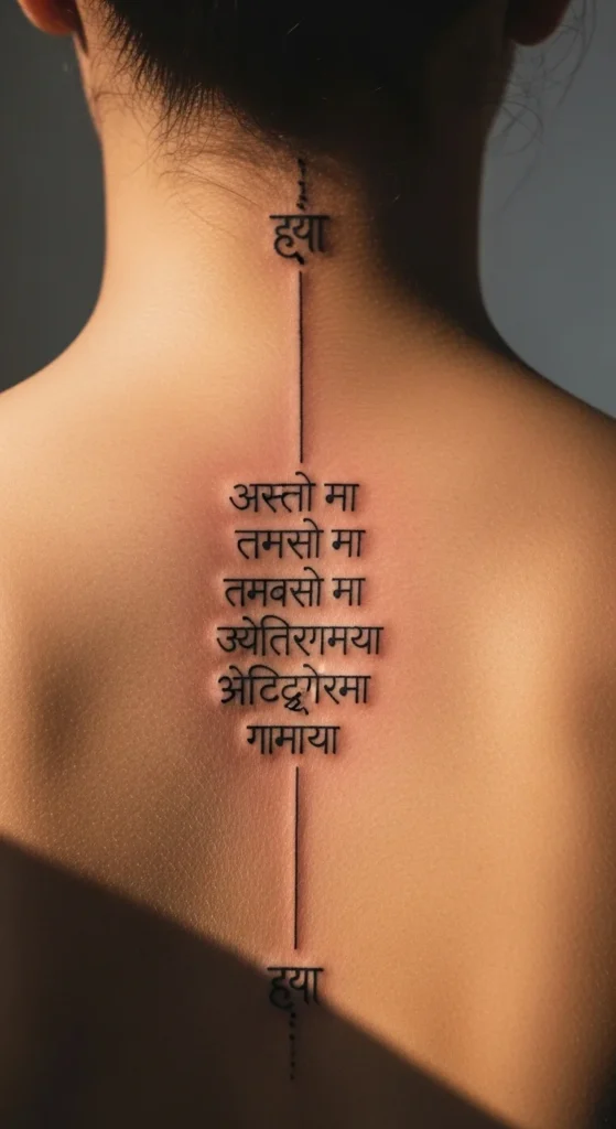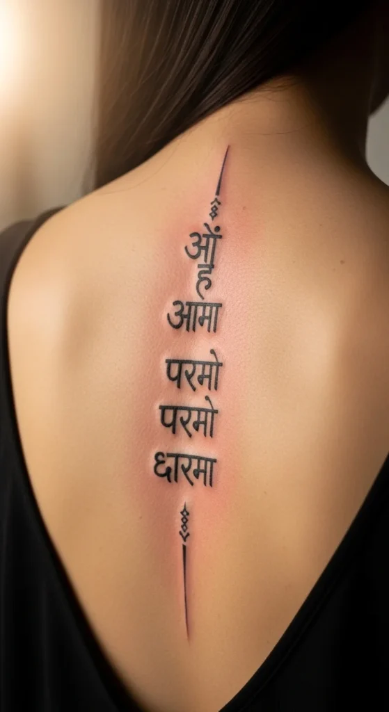 The Gayatri Mantra is meaningful but long, so many people choose a shorter fragment. Place it horizontally across the shoulder or vertically down the forearm. Because spacing is so important, print the phrase in a large font before reducing it to tattoo size. This helps you catch character errors early. Stick with black ink to keep the design simple and affordable.