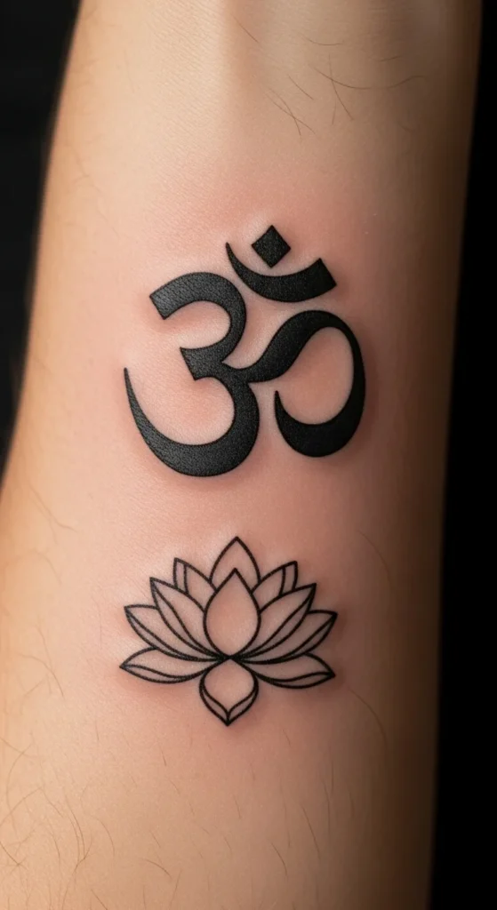 Pairing Aum with a lotus gives the design a gentle spiritual feel. Keep the lotus simple so it doesn’t overpower the script. A thin outline works best and keeps cost low. This idea fits ankles, shoulders, and forearms. If you want color, choose a very light red accent so it stays subtle. Many people sketch this combination themselves before visiting a studio since it’s easy to draw and adjust.