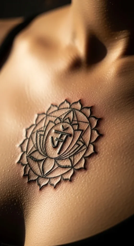 The heart chakra symbol works well for people who connect emotional healing with body art. It looks clean in geometric form and doesn’t require shading. Place it near the sternum for a symbolic touch or on the wrist for simplicity. You can outline the twelve-petal structure with very thin lines. This keeps the look calm and prevents the tattoo from feeling heavy. Try a stencil on your skin first to judge symmetry.
