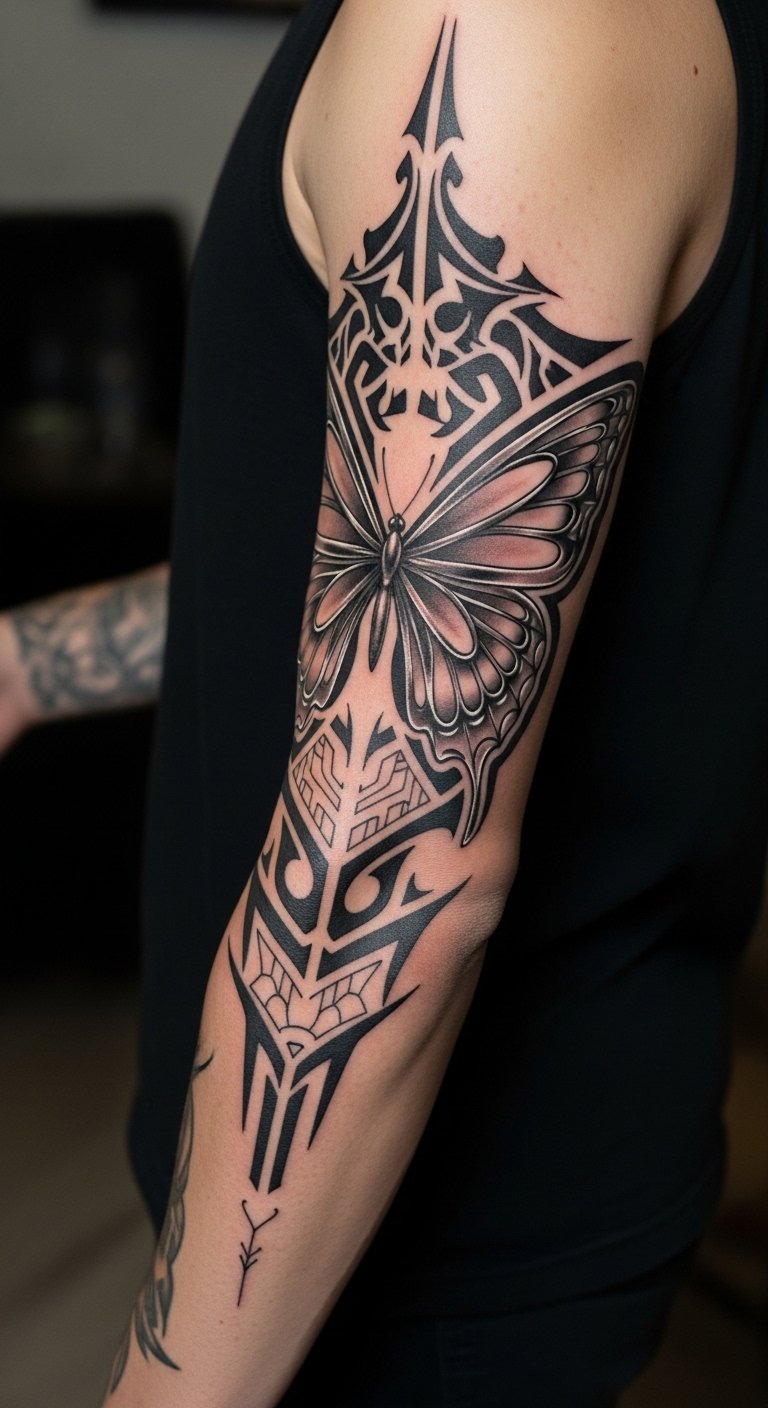 I saw the Y2K resurgence firsthand—tribal flames and chrome butterflies reappearing, but executed with a modern fine-line hand. The charm is nostalgia with contemporary aging in mind: fine-line execution avoids the thick, dated look of early 2000s pieces. Placement across the lower arm or bicep allows motifs to interlock. Pain is moderate depending on location; numbing may help for dense sessions. Common mistake: asking for exact throwback designs without adjusting line weight—ask for modernized contrast so the piece ages cleanly. Fusion requires an artist comfortable blending thick-referenced motifs into subtle single-needle elements; bring examples of both vintage and modern takes.