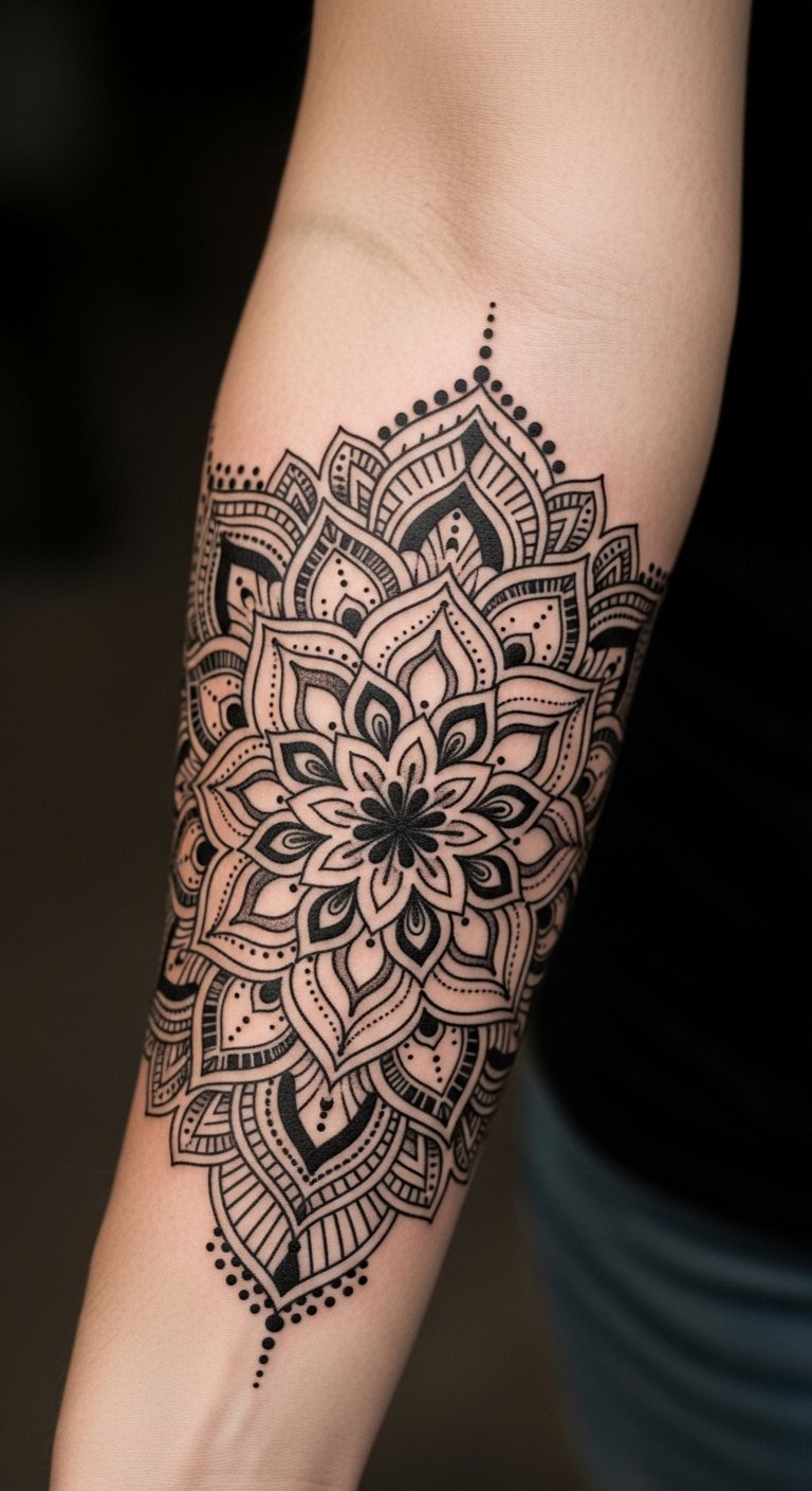 I’ve always recommended mandalas for clients who want repeatable symmetry and meditative visuals. Outer forearm placement keeps the design visible and easy to show off without heavy stretching. Pain is usually lower here, though dotwork sections can feel like repeated pinpricks. Mandalas often rely on contrast and precision; healed photos are crucial—ask to see how dotwork settles on similar skin tones. One common misstep is too much detail in a small area; mandalas scale best when they have room. Discuss how the mandala will interact with the rest of your sleeve—will it be a central piece or a component in a larger geometric narrative?