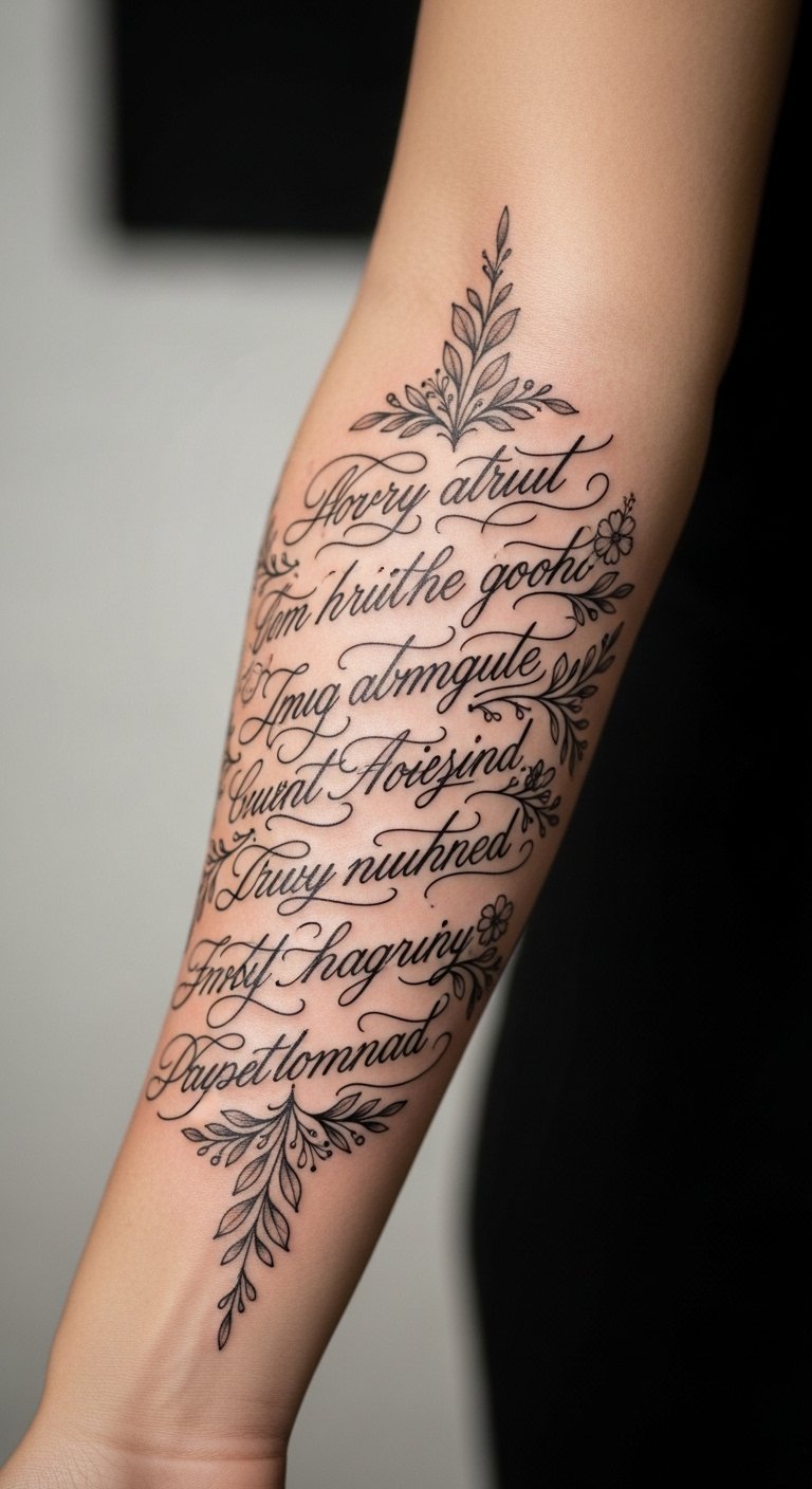 I’ve tattooed song lyrics across a forearm and learned that script can be powerful when combined with decorative elements. The challenge is legibility over time—ask for letters that aren’t too thin. Forearm placement is ideal for showing and reading the script. Pain is low. Healed script tends to soften, so aim for moderate stroke weight. Common error: using overly ornate fonts that merge into illegible lines after a year. Ask your artist to write the script on skin first and show a healed example on similar skin tone. Decorative anchors (small roses, dots, or vines) help tie script into a broader sleeve.