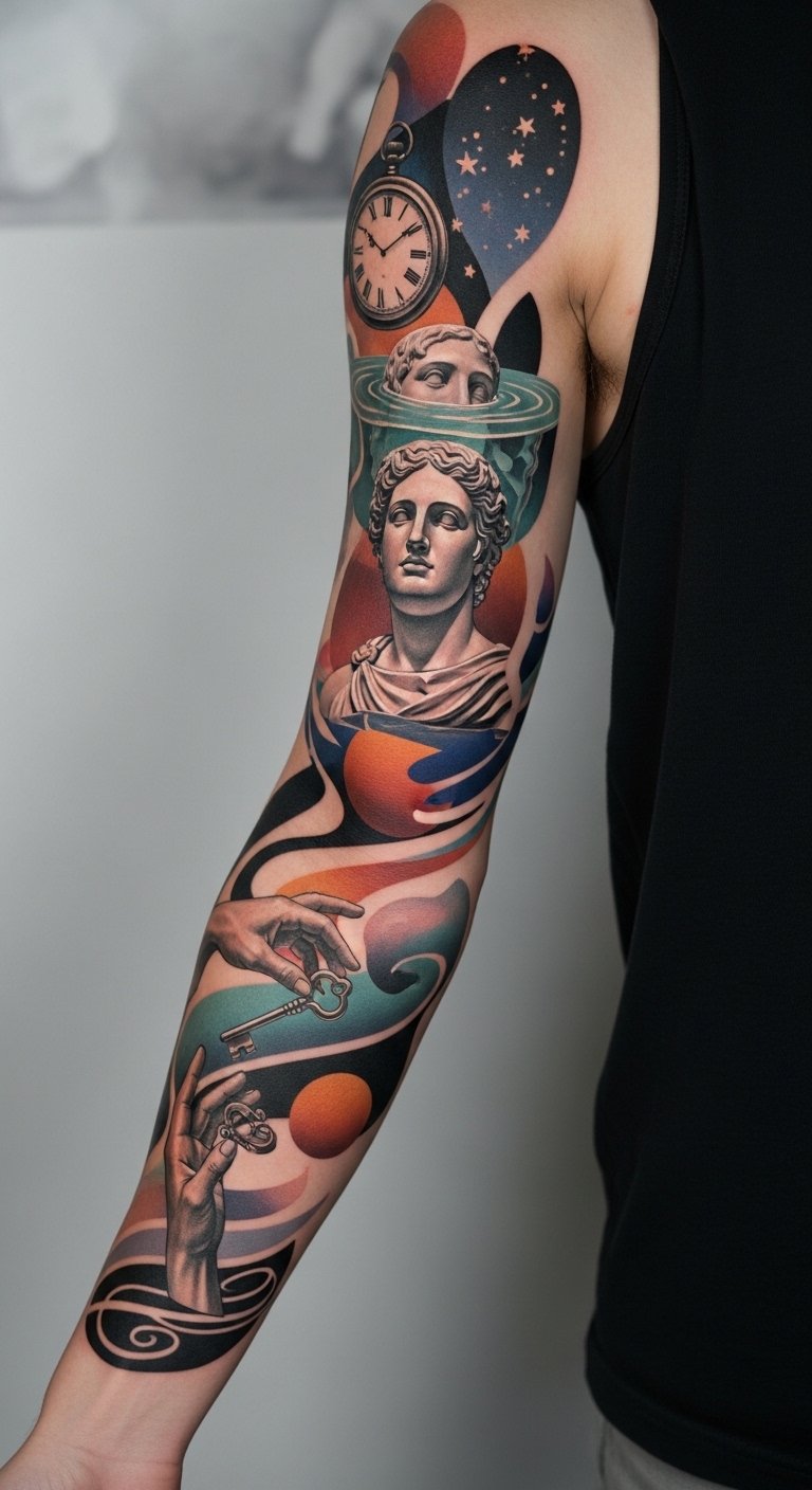 I sketched a surreal sleeve once to map life moments—floating objects that symbolized important memories. The sleeve reads as a dream when the artist creates soft transitions and deliberate negative gaps. Pain varies by area, and long sessions may be needed to build layered effects. Healing is standard, but fine blending requires careful aftercare to avoid patchy shading. Common mistake: too many competing focal points. Define a clear visual hierarchy—what floats forward, what recedes. Show your artist reference collages so they can plan cohesive color and contrast.