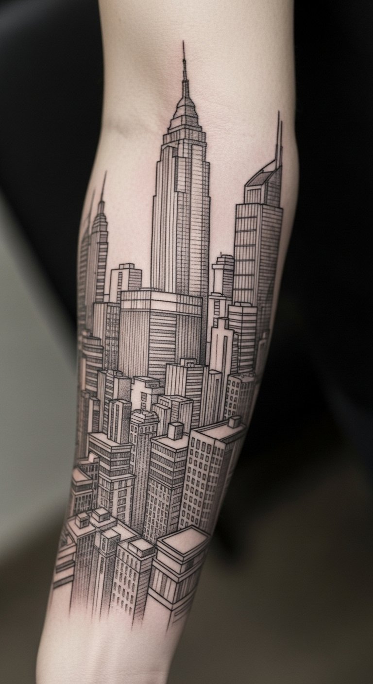 I drew this one for a friend who loves skylines—the sleeve reads like a city that wraps the arm, with perspective lines matching muscle flow. Outer arm placement lets the horizon read naturally. Pain is typically lower, but connecting perspective across the elbow requires expert line alignment. Healed results hinge on clean, steady lines; ask to see long-arm healed shots. The biggest mistake is inconsistent vanishing points—get an artist who plans on paper and maps the arm beforehand. Keep contrast in mind; tiny architectural details may need bolder anchors to survive years.