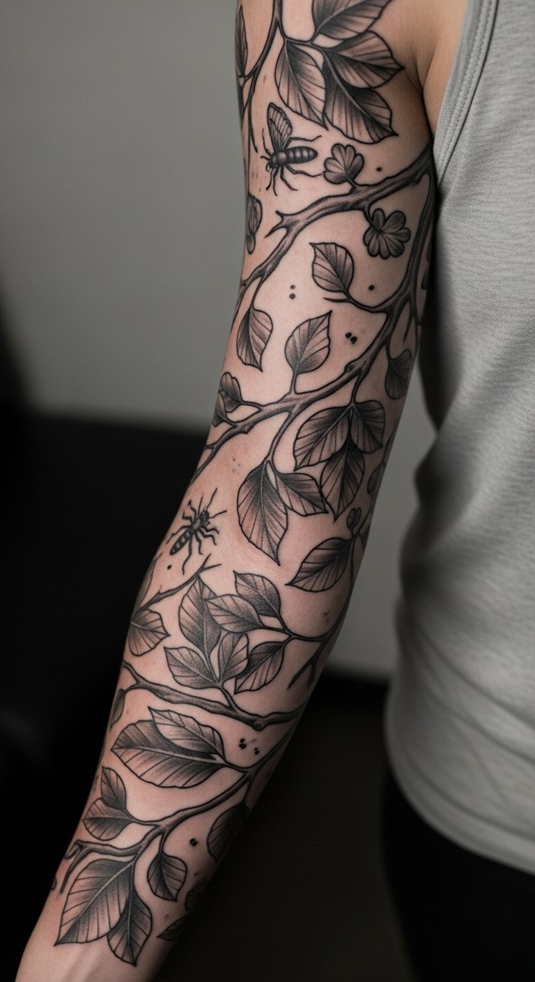 I’m partial to sleeves that reward close inspection: a small moth tucked behind a leaf, a snail path along a branch. Black-and-grey botanical sleeves age well because of strong contrast and the ease of touch-ups. Forearm or outer arm placement works great for viewing and for letting details flow. Pain is manageable, though line-dense sections can be tedious mid-session. A common misstep is overcrowding—plan breathing spaces so critters don’t compete. Look for artists comfortable with micro-details and ask for healed macro photos to see legibility.
