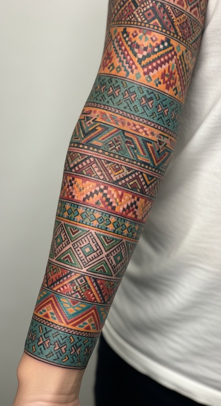 I’ve seen sleeves inspired by family textiles—kilim rugs, embroidered tablecloths—turn into sleeves that feel like wearable heritage. Pattern repeats wrap nicely around the arm and can be scaled to suit. Pain is moderate, depending on fill density. Colors should be bold enough to survive aging; pattern clarity is essential. Mistake: straight-up copying tiny textile stitches instead of translating them into tattoos—work with an artist who can interpret technique into lines and fills. Ask to see similar pattern-based sleeves healed.