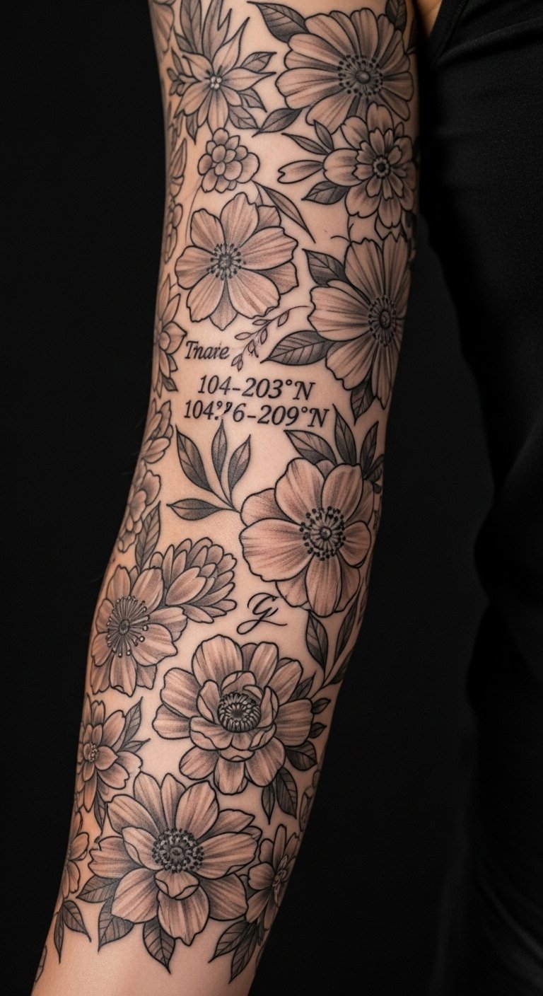 I often see clients embed dates and coordinates into floral sleeves—it's a neat way to keep meaning private yet woven into the design. Placement can be anywhere, but forearm and bicep are convenient for reading and hiding small text. Pain is mild but micro-script requires careful planning to remain legible after healing. Avoid trying to fit lengthy text into tiny spaces; keep it short and paired with a bold anchor so it stays readable. Ask to see healed micro-script examples on similar skin tones.
