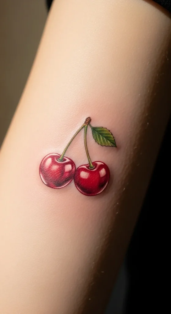 Microrealism fruit tattoos have become a cute extension of the sticker tattoo trend. A tiny cherry, strawberry, or lemon slice looks charming and fun without feeling childish. If you want to test it, print a small fruit sticker and place it near your wrist. This helps you see color placement before committing. Keep the tattoo under 1 cm for the softest effect. Because color work can cost more, you can choose a tiny outline instead. It’s playful, symbolic, and very popular with people collecting multiple minis.