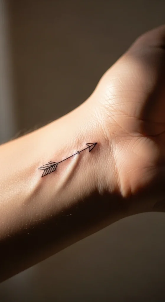 A tiny arrow works great if you want something tied to direction or personal progress. These tattoos stay clean when kept small. You can test it by drawing a short arrow near your wrist and checking how it looks in different angles. Artists say arrows fit nicely in sticker-style clusters as well. They’re quick and budget-friendly to get because the design is simple. Try placing it horizontally for a gentle look or vertically for something more symbolic.