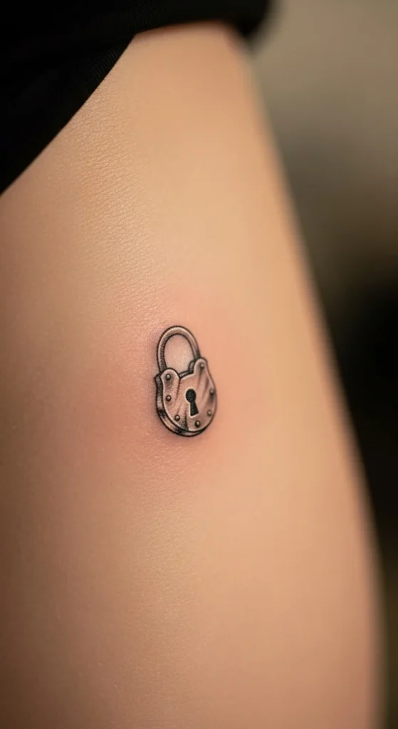 A mini lock symbol pairs well with tiny hearts, keys, or initials. It’s sweet without being too bold. To test it, print a tiny outline and place it on your hip crease or inner arm. Keeping it under 1 inch keeps it soft and discreet. This style fits into the hidden tattoo trend that many beginners love. It’s also quick to apply and stays affordable. You can match it with a key tattoo for a friend or partner if you like subtle pairs.