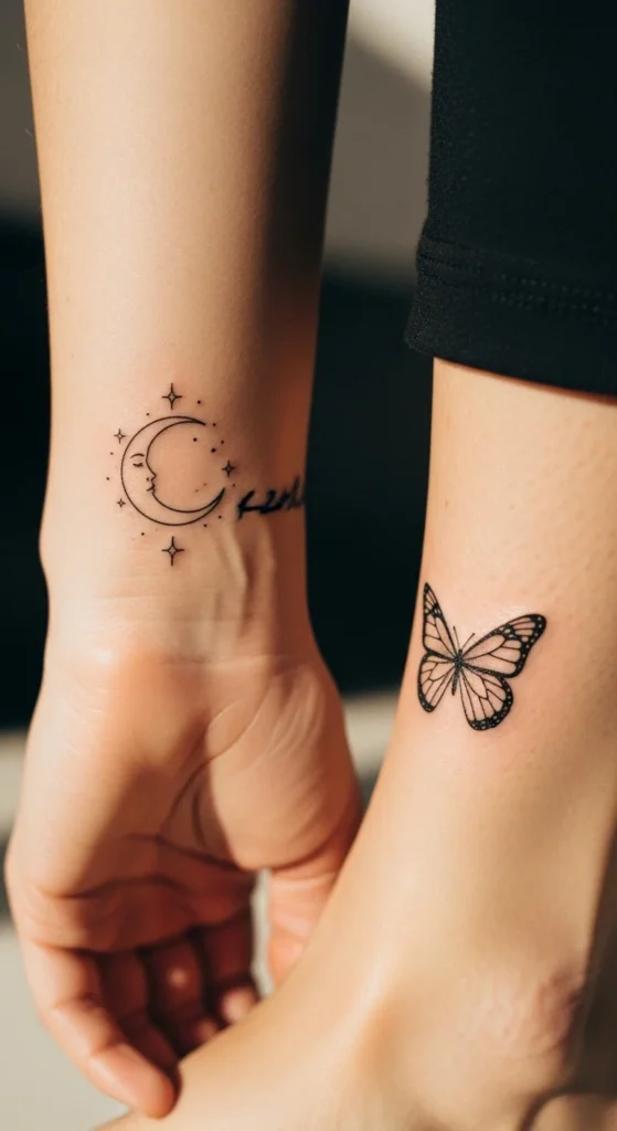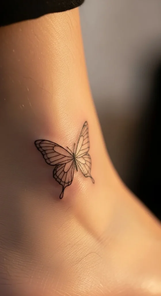 A micro butterfly outline is a classic symbol of change. It’s delicate, small, and perfect if you want something thoughtful without loud imagery. Fine-line artists recommend outlines because they stay soft and age nicely on smoother spots like the ankle or collarbone. The design is easy to test with a pencil sketch taped to your skin. Keep it under 1 inch if you want it subtle enough to hide when you choose. Many people love placing them behind the ear or on the shoulder blade for a quiet look. You can save money by choosing a single outline instead of shaded wings. You can also match it with a second tiny symbol—like a star or a dot—if you want a more personal story. This style blends nostalgia and modern trends, especially with today’s microrealism wave. You get something sweet and meaningful without going too bold or committing to a large piece.