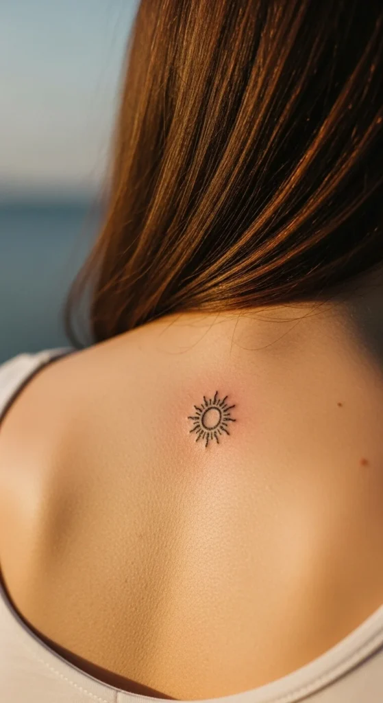 A mini sun outline brings a warm, cheerful vibe without being loud. It’s easy to sketch and test at home. Keep the lines clean and short so the tattoo feels gentle. This style does well on the shoulder blade or hip. You can add a tiny dot in the center if you want to personalize it. Artists say mini suns stay popular because they work well in patchwork clusters. They’re also affordable and quick to apply.