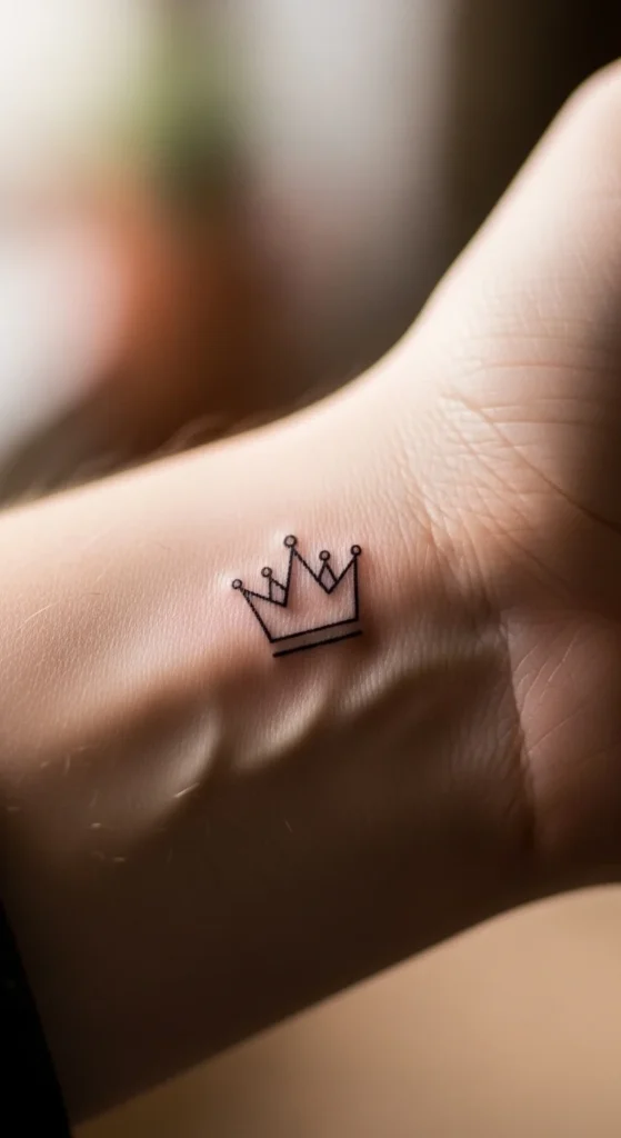 A tiny crown outline adds a confident touch without feeling flashy. Keep it simple with clean, thin lines. Test the design by taping a printed crown outline onto your wrist. Many people choose this tattoo to mark personal growth or success. It’s quick to apply and easy to hide if you want something discreet. Pair it with a tiny dot or initial for extra meaning. The small size keeps it budget-friendly.
