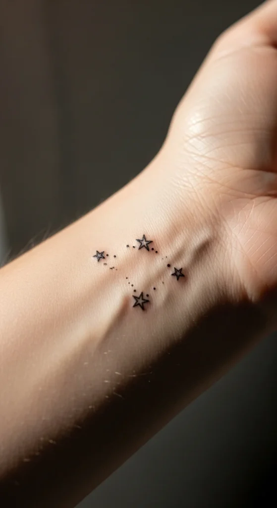 Mini star clusters feel playful and work almost anywhere. You can arrange three or four stars like your own tiny constellation. Artists say this style fits perfectly into the “sticker tattoo” trend clients are asking for in 2026. You can test the spacing using star stickers from any craft store. Place them on your wrist or collarbone and see how they look in different lighting. If you want something symbolic, try arranging stars to represent birthdays or milestones. These clusters stay budget-friendly because each star takes very little time to tattoo. Many people add them over the years, creating a patchwork feel without committing to a full sleeve. They’re especially charming on the shoulders or ribcage—just light enough to feel soft and quiet.
