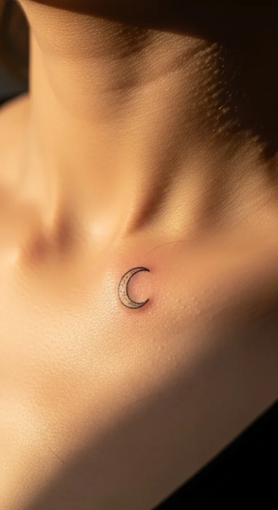 A small crescent moon is peaceful and simple. It works for anyone wanting a quiet symbol tied to intuition or personal reflection. These tiny moons look best when kept minimal with clean, thin lines. To test the idea, draw a small curve on your collarbone and take a quick photo to check visibility with different tops. Many people pair the moon with a tiny star or dot for a soft touch. It’s also a beginner-friendly tattoo because the lines are short and quick to apply. You can keep this design under 1 cm to make it nearly invisible unless someone is close. It’s one of the most flexible small tattoo ideas thanks to its soft, timeless look.