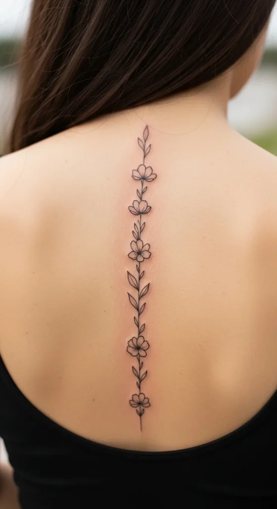 A floral cascade works well for anyone who prefers gentle detail without heavy shading. It flows down the vertebrae and adds a soft, elegant touch. Keep the design simple if you want faster healing and a lower price. Start with one or two blossoms, then extend it later. Bring reference photos so your artist captures the spacing you like. You can also ask for a single-needle style for a lighter feel. If you’re on a tight budget, skip color and stick to line work. It still looks striking but costs less and requires fewer touch-ups over time.