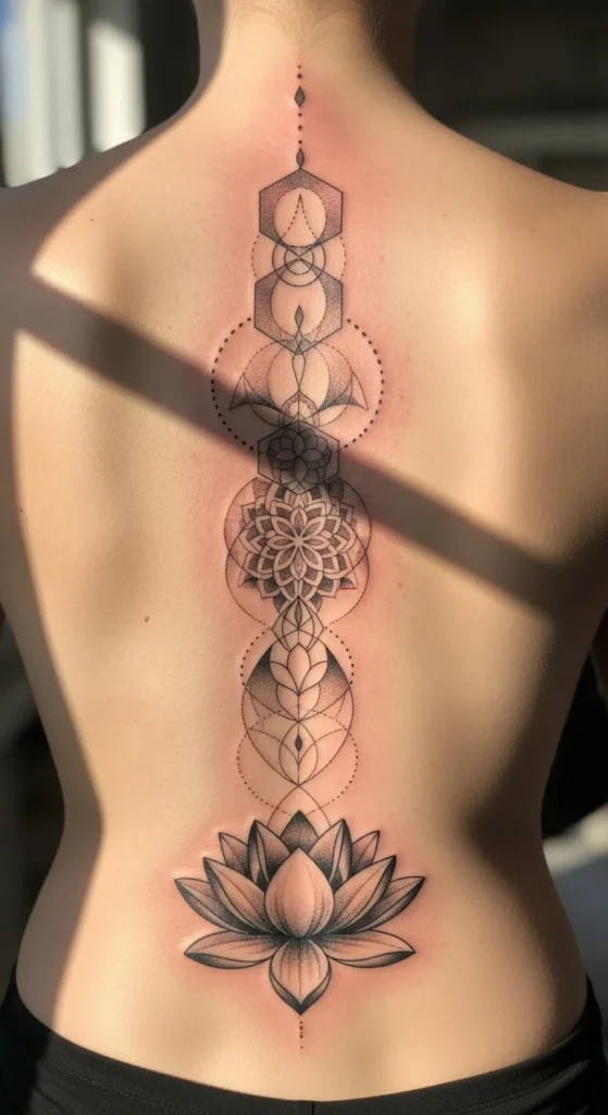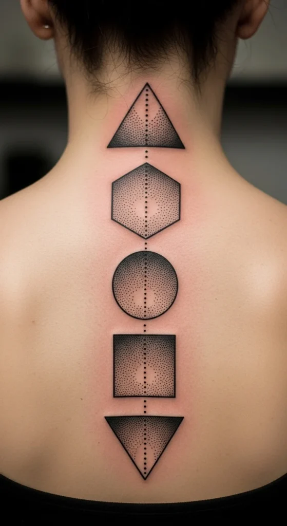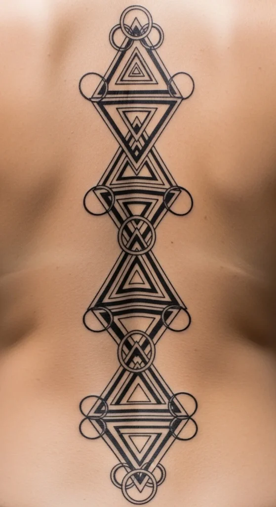 Sacred geometry fits the spine perfectly. Shapes like triangles, circles, and diamonds create a neat vertical flow. This design is ideal for minimalists who still want something visually interesting. Keep the shapes uniform for a tidy structure. You can start with three shapes and extend later as your budget allows. Because it’s mostly line work, the healing process is simple. Black ink works best for long-term clarity.