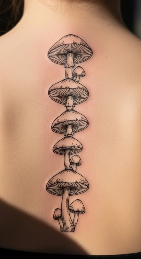 Mushroom tattoos offer a playful, surreal idea for the spine. They add personality without requiring intense detail. Choose elongated stems so the design naturally follows your back. A monochrome style keeps the cost low and makes touch-ups easier. If you want color, keep it minimal. Mushrooms can symbolize growth, creativity, or personal chapters. Ask your artist to sketch two or three shapes and stack them in a tidy line for a clean outcome.