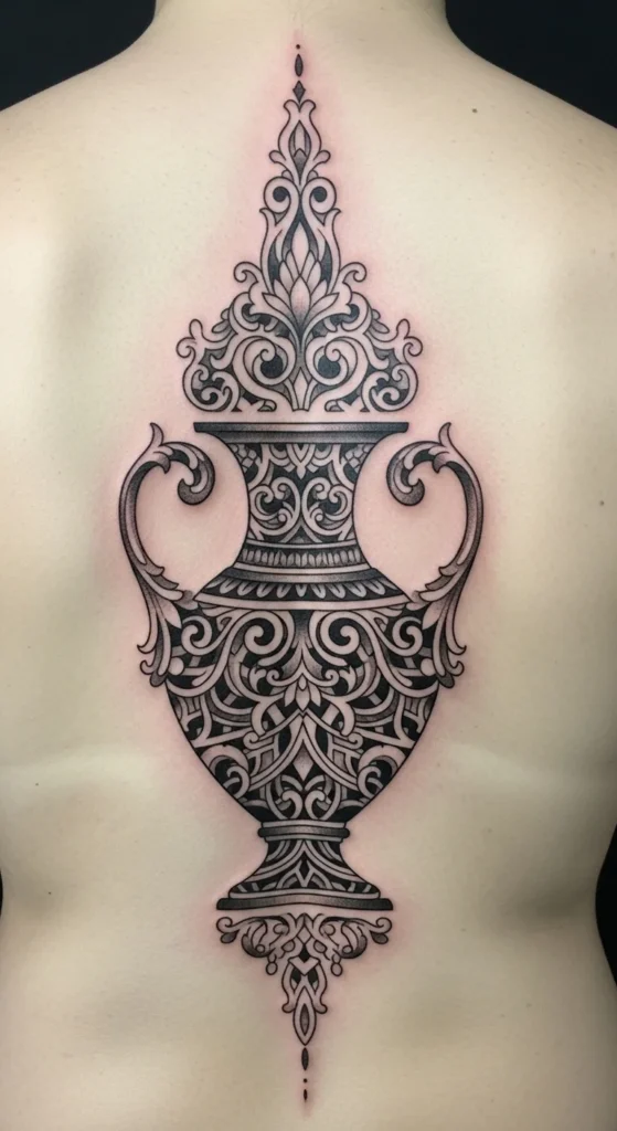 Optical illusions make your spine design stand out. The vase concept uses curved shapes that create visual interest without needing shades of color. This idea works best with simple outlines and even spacing. Your artist will likely create a digital mock-up to show how the shapes fit your back. If you want something budget-friendly, keep the design small and centered. Illusions like this rely on clean execution, so choose an artist familiar with line accuracy.