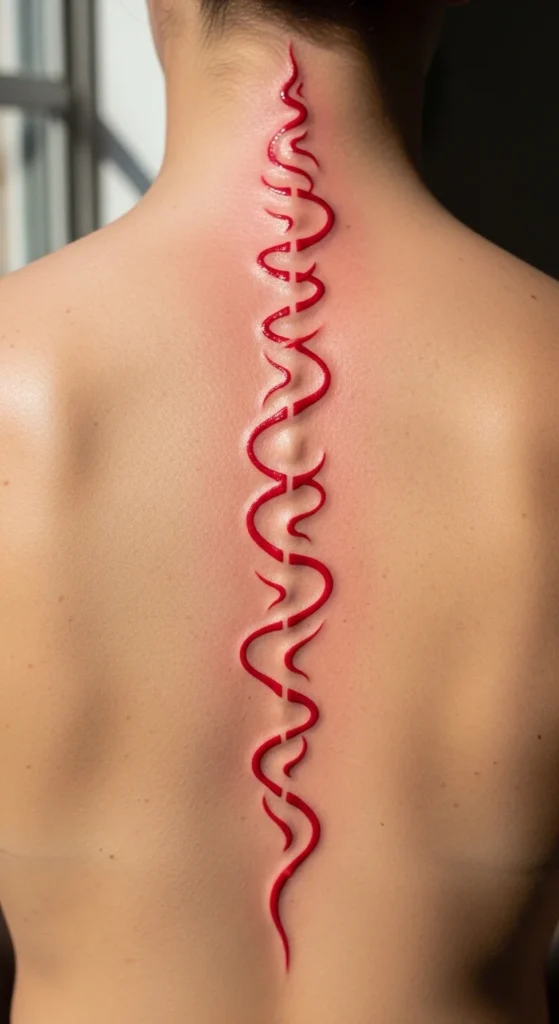 Red ink looks striking down the spine. It stands out against most skin tones and offers a modern appearance. Keep the design clean so the color stays crisp. Red ink may fade slightly faster than black, so choose smaller shapes if you prefer low maintenance. Many people use red for symbols, abstract lines, or florals. If you’re trying to save money, stick to one shade of red instead of gradients.