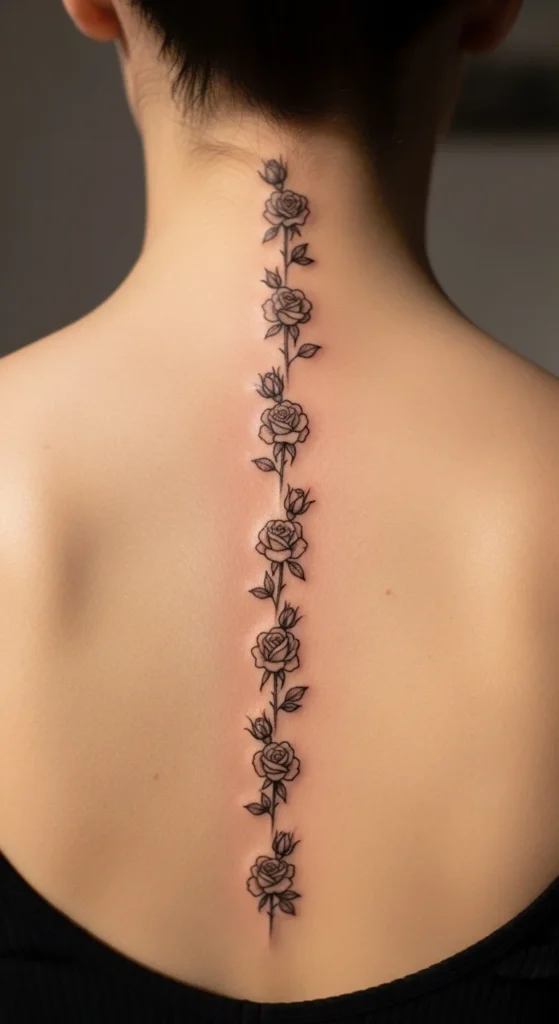 Tiny roses create a romantic, gentle spine concept. They work well for anyone who enjoys floral art but wants something easy to manage. You can place three to five roses along the spine for a simple layout. Outline-only roses are budget-friendly and heal quickly. Ask your artist for soft curves so the flowers sit naturally. This idea suits different ages and styles because you can expand it later if you want.
