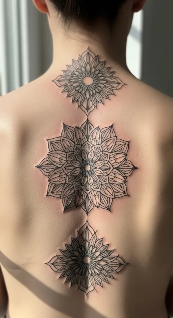 A mandala spine piece creates balance and visual harmony. It’s especially popular for people who want meaning tied to structure and calm shapes. Choose two or three stacked mandalas instead of a full back layout if you want to keep cost manageable. Start with a small center mandala at the mid-back and build around it later. Ask your artist about spacing so the design fits accurately along the center line. A grayscale approach works well because it heals faster and stays sharp for years. It’s an adaptable idea that you can grow in sections over time.