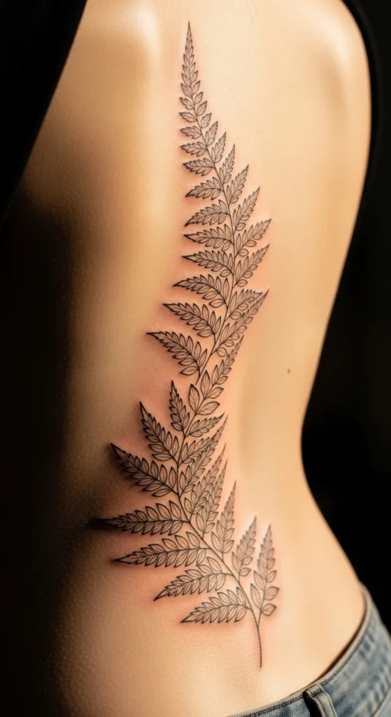 Fern tattoos are calm and nature-focused. Their shape fits the spine beautifully because of the leaf arrangement. Keep the outline thin so it feels soft against the skin. You can choose one long fern or two shorter ones stacked vertically. A simple outline helps keep the price friendly and the healing smooth. This idea also works well for cover-ups because the shape provides natural camouflage.