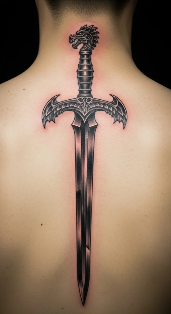 A sword placed along the spine delivers a bold and structured look. It symbolizes protection and inner strength. Keep the blade narrow so the design fits your proportions. If you’re saving money, choose a simple outline with light detailing at the hilt. Many people pair this with wings or geometric shapes, but it also works on its own. Print several sizes at home to find the best fit before committing.