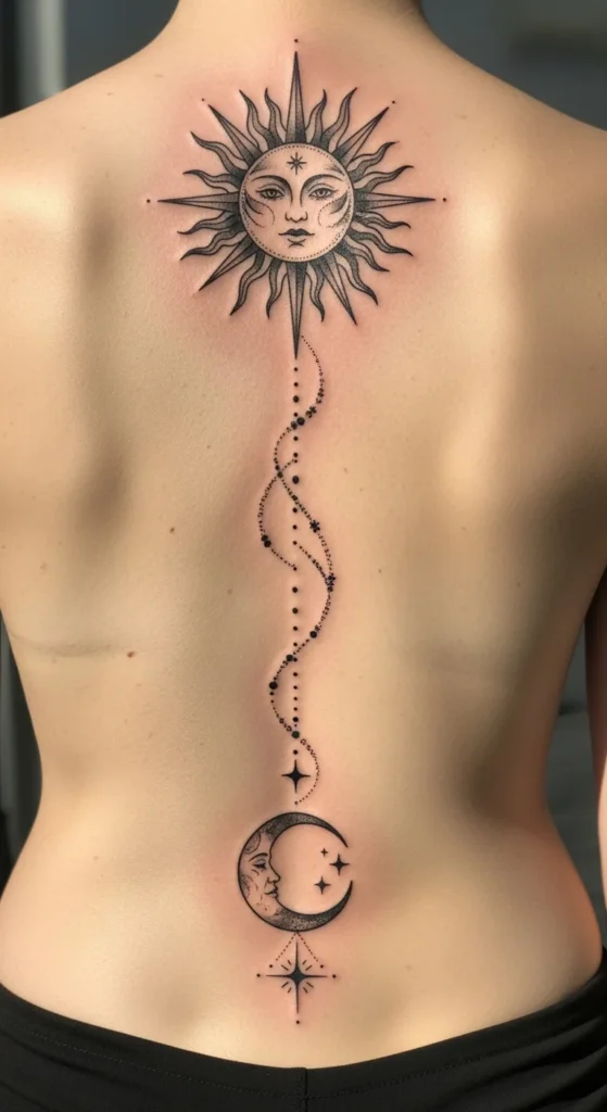 The sun and moon combination represents balance and duality. Placing them on the spine keeps the layout tidy and centered. You can add small dots or lines between them for flow. The design is affordable because it relies on simple shapes. A grayscale version works well for anyone worried about fading. Ask your artist to adjust spacing based on your height so the symbols sit comfortably.