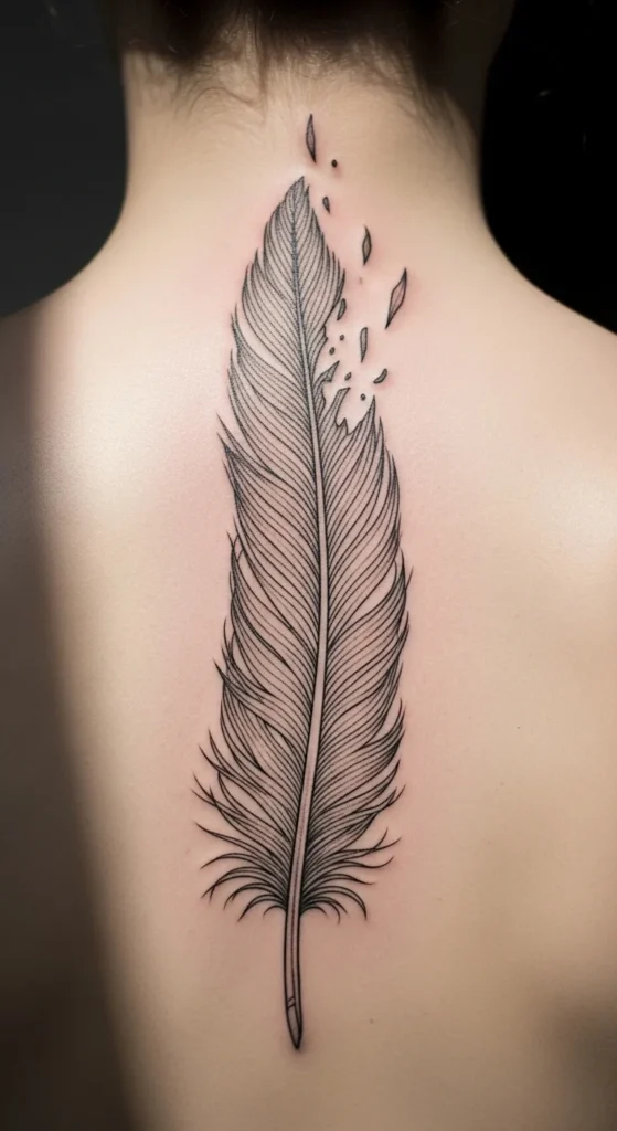 Feathers are timeless and expressive. They represent freedom and lightness. A long feather along the spine feels graceful without being heavy. Keep the lines soft and avoid thick shading so the design ages well. This idea is great for beginners because it’s usually done in one session. A vertical feather is also easy to customize later with tiny dots or shapes.