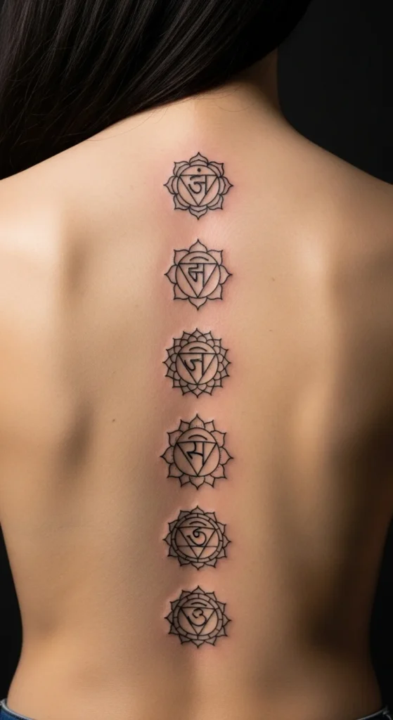 Chakra symbols placed down the spine follow the body’s natural energy line. Many people choose this concept because it feels meaningful and calming. You can keep each symbol small to save money and reduce session time. If you want color, limit it to one or two shades so future touch-ups stay affordable. The symbols can be evenly spaced or connected with a thin line for a smoother flow. Try printing small circles and taping them to your back to find the spacing that feels right.