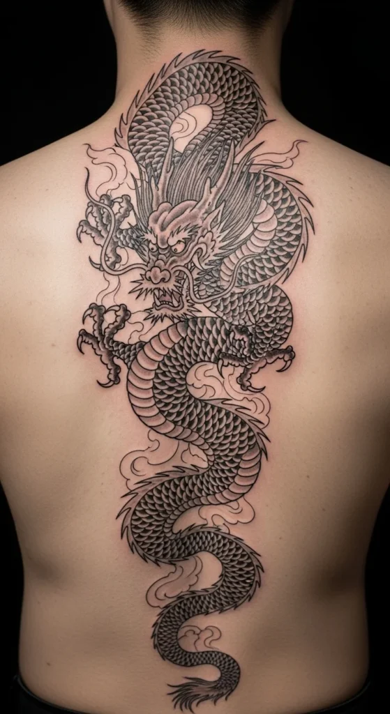 A dragon spine piece stands out instantly. It’s a favorite for bold personalities who want something symbolic and strong. You don’t need full-scale shading to make it impactful. A clean outline with light texture looks just as impressive and costs far less. Dragons allow a lot of creative freedom—curved bodies fit naturally against the spine’s shape. If you want a shorter session, choose a slim, elongated dragon instead of a thick-bodied one. This helps with pain management and keeps healing simple.