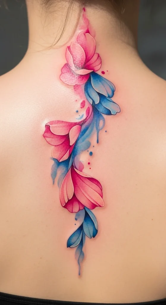 Watercolor tattoos appear soft and expressive without heavy lines. They work beautifully with florals along the spine. To keep costs down, choose one or two tones instead of a full-spectrum palette. Watercolor will require occasional touch-ups, so plan for that before committing. You can start with a small bloom at the top, then add flowing splashes later. Use gentle shapes so the design feels cohesive rather than crowded. This style suits anyone who prefers color without harsh outlines.