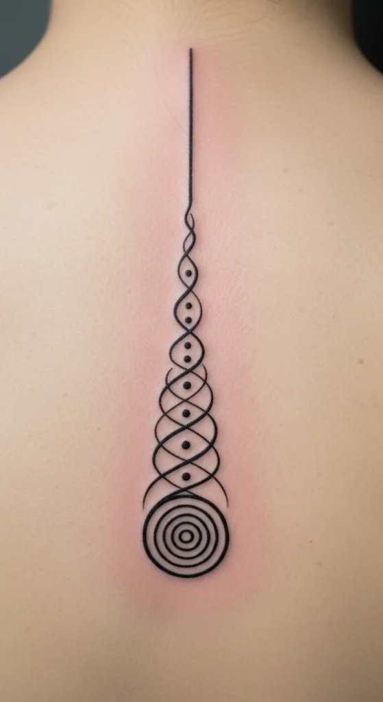 The unalome symbol represents growth and personal progress. It aligns beautifully with the spine’s natural shape. Keep the curves soft and open so the design doesn’t look crowded. This is one of the most affordable options because it requires minimal detail. Many people choose to add a small lotus at the end for meaning. Ask your artist to mock up several sizes so you can compare. If you’re sensitive to pain, keep the design short so the session stays comfortable.
