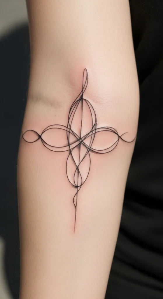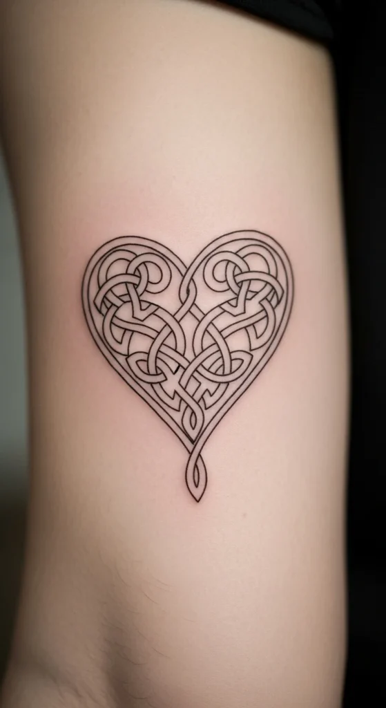 A Celtic heart combines softness and heritage. Using one line keeps it gentle and modern. It works well on the forearm or shoulder blade.