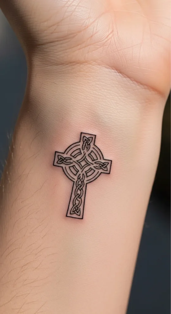Outline-only designs reduce cost and healing time. Minimal crosses feel respectful without heaviness.