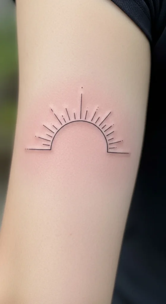 This tattoo fits well above the elbow or along the ribcage. Ask for a thin line so it stays light. Avoid stacking multiple arcs if you want to keep costs low.