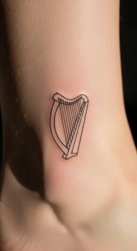 A harp outline feels elegant without detail overload. Thin lines keep it light. This works nicely on ankles or calves.