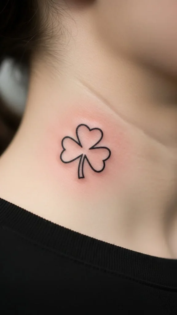 A single clover leaf keeps the vibe subtle while still reading as St Patrick’s Day. The side neck is a bold placement, but the tiny size makes it feel calm and wearable.