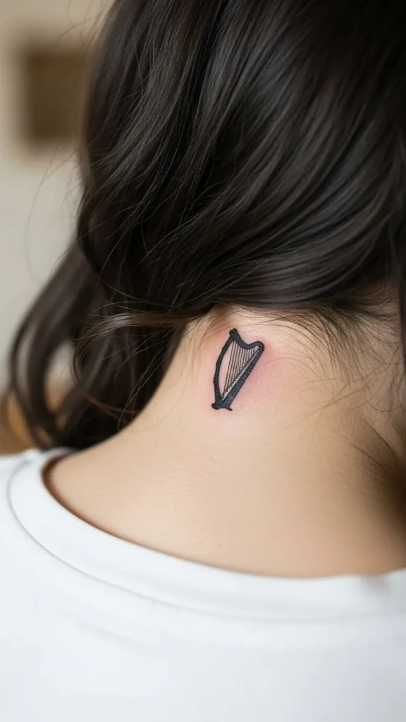 The Irish harp is classic, but the trick is keeping it small and simple. A tiny silhouette near the nape looks like a little charm. It’s easy to cover with hair and easy to show off with a ponytail.