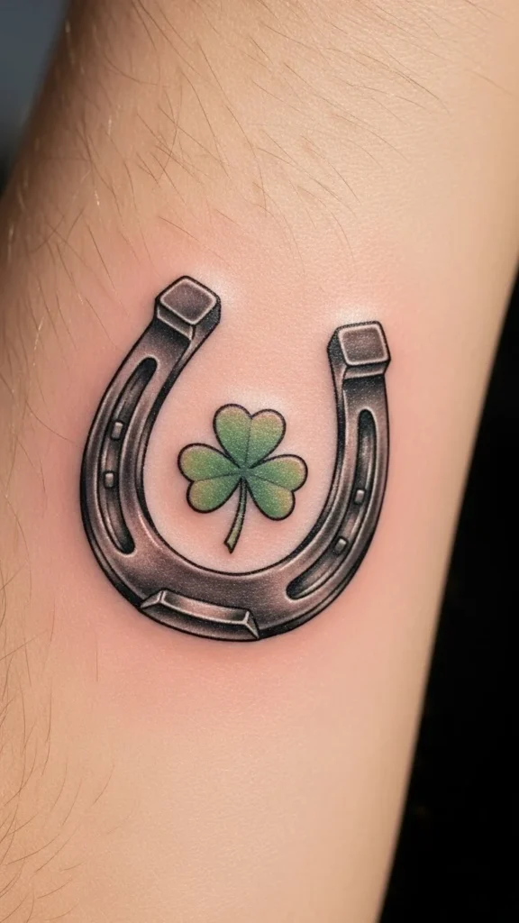 Sketch a horseshoe outline on paper and place a tiny shamrock inside or beside it. This helps you decide the balance. For a smaller budget, stick with linework and skip metal-style shading. This tattoo fits nicely on the forearm or upper arm. Choose a small pop of green to make the shamrock stand out.
