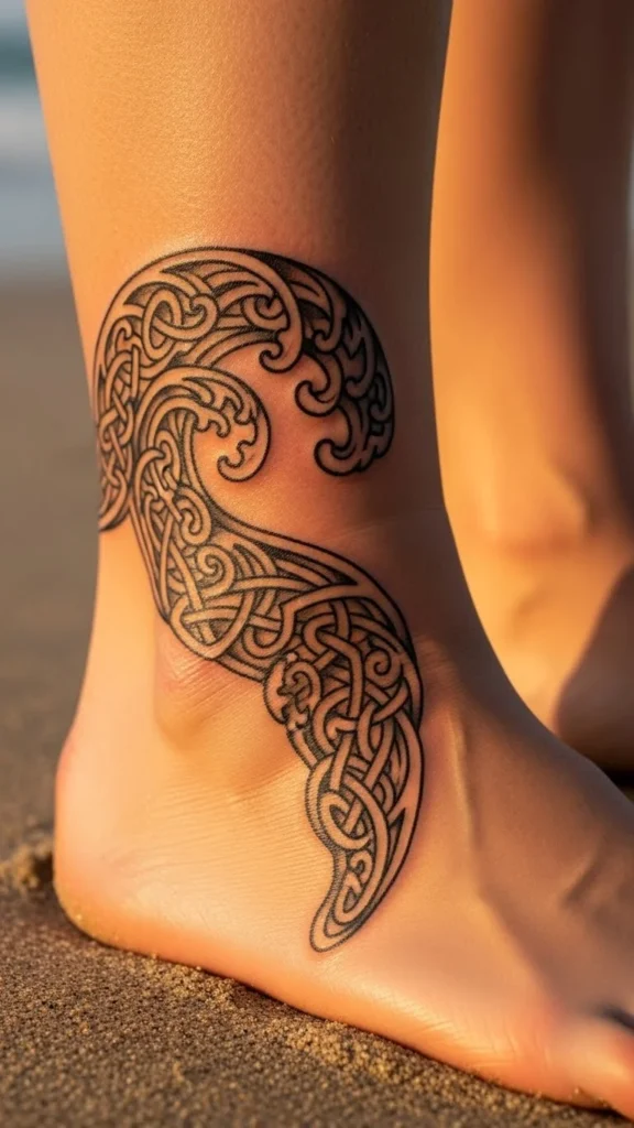 A Celtic wave pattern brings movement and calm energy. It’s great for people who feel connected to the sea or Irish coastal landscapes. The design can be as simple or detailed as you want.